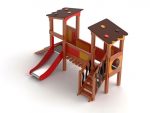 First Steps Aires De Jeux« Tours jumelles » est un système de parc de jeux à deux tours, avec suspension et un pont en bois entre les deux. De plus, l’enfant peut finir le parcours en glissant sur toboggan après les passages.